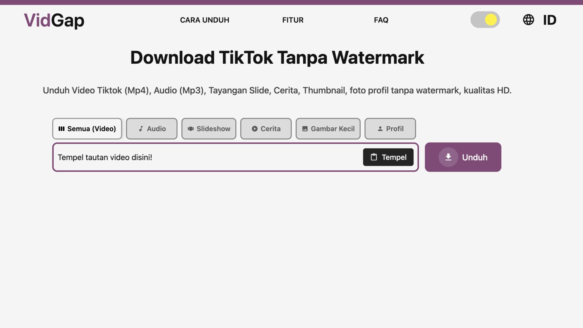 Watermark sering kali mengganggu tampilan video dan mengurangi kualitas pengalaman menonton. Dengan mengunduh video tanpa watermark, Anda bisa menikmati konten dengan lebih jernih dan membagikannya kembali tanpa tanda khusus. Ini sangat berguna bagi kreator konten yang ingin menggunakan kembali video untuk keperluan pribadi atau profesional tanpa gangguan visual. VidGap hadir sebagai TikTok Downloader Terbaik yang memungkinkan Anda menyimpan video favorit dalam kualitas tinggi, tanpa watermark, dan tanpa ribet. Dengan antarmuka yang ramah pengguna, siapa pun dapat mengunduh video TikTok hanya dalam beberapa langkah sederhana tanpa harus menginstal aplikasi tambahan.